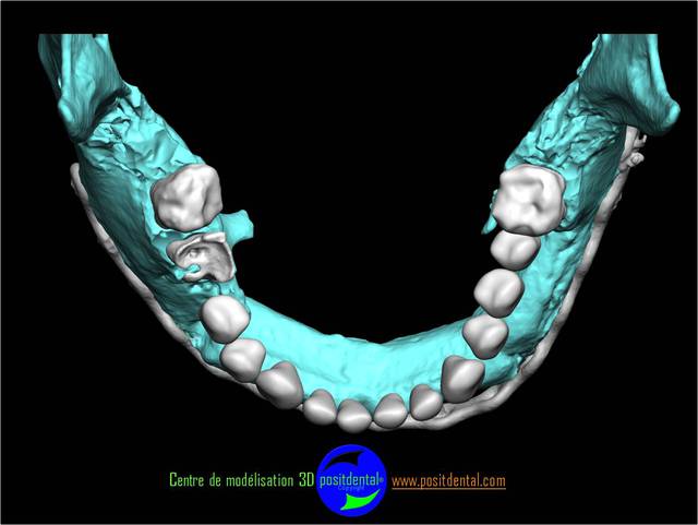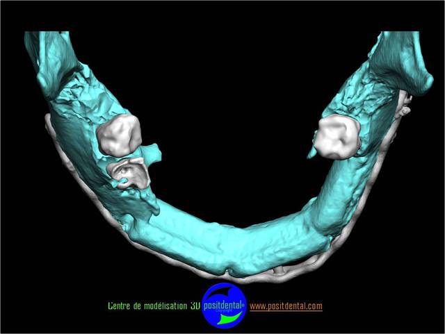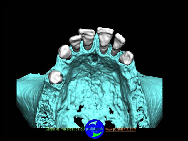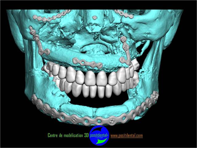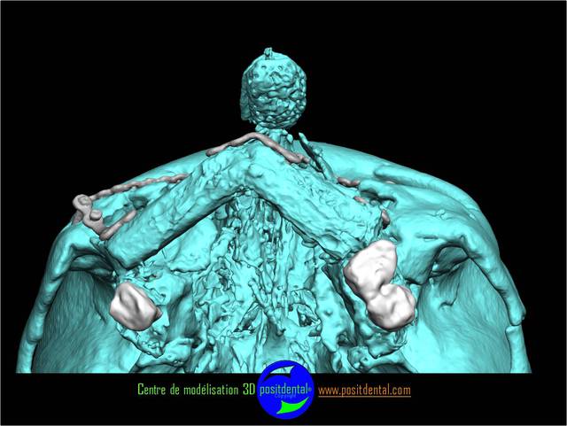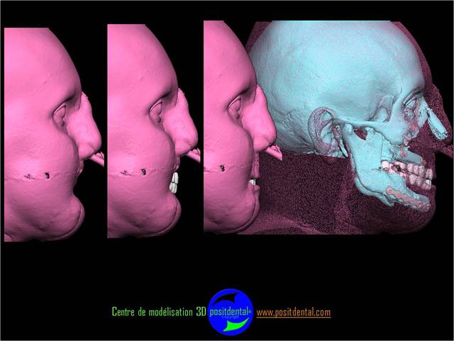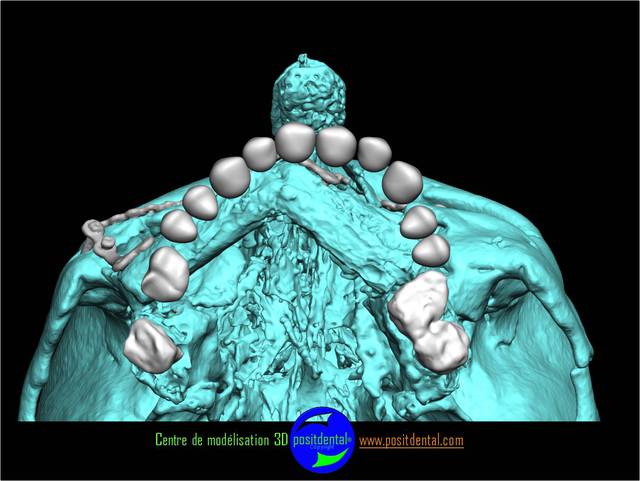 Comme tu peux le remarquer la difficulté d’implanter sur un péroné est l'absence des repères anatomique habituel. Le positionnement virtuel des dents se fait en rapport de la base du nez et de l’ouverture buccale, une vision globale structure osseuse et tissus mou est utilisé.