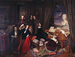 Danhauser, qui avait été marqué, comme la plupart de ses contemporains, par le jeu puissant et virtuose de Liszt lors de ses concerts viennois, imagine de représenter non seulement le pianiste devant son instrument, mais une société idéale réunissant des musiciens et des écrivains dans une communion intellectuelle et spirituelle créée par la musique de Beethoven, que Liszt interprète avec révérence. Autour du pianiste ont donc pris place Victor Hugo, Alexandre Dumas, George Sand, Niccolo Paganini, Gioacchino Rossini, Marie d’Agoult. Le tableau de Danhauser regorge ainsi de symboles et d’allusions, qui ont tous pour objectif de livrer une image idéalisée des artistes romantiques, réunis par le plus romantique de tous les arts : la musique.