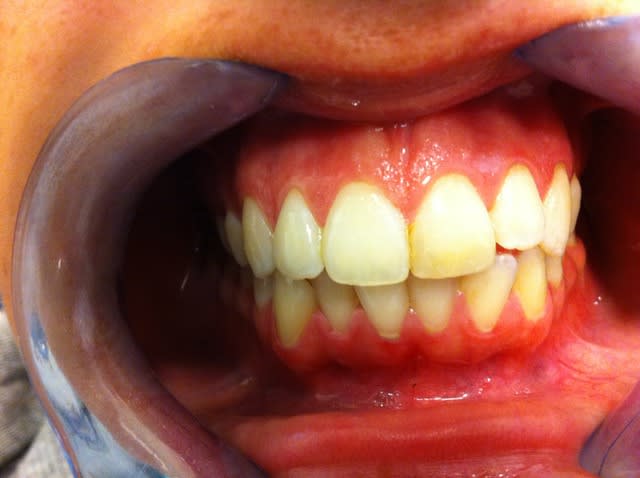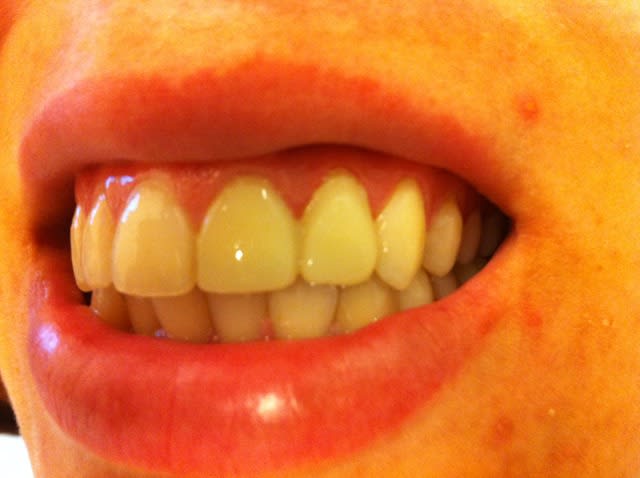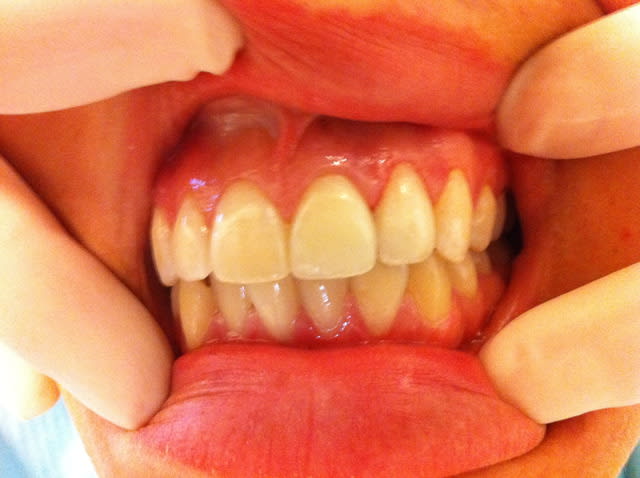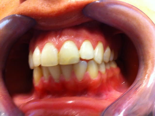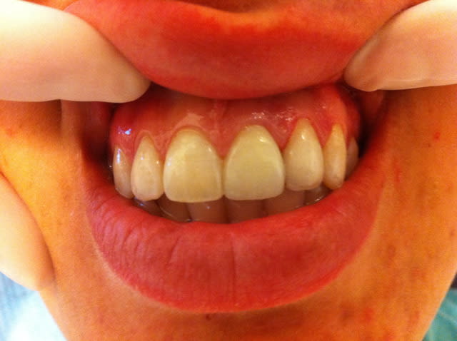 Facette Emax et collage Variolink (photo le jour de la pose). Provisoire faite avec du voco structure (la photo des prov a été prise à J+8), pas besoin de ciment temporaire.