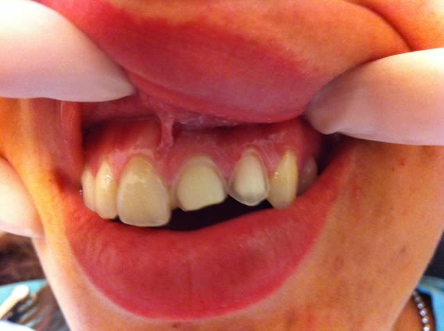 Sa demande était son vilain composite sur 21 qu'elle avait déjà fait trois fois, et maintenant la dent est sensible au froid; ainsi que la 22 qui était trop courte par rapport à la 12 et elle déteste voir sur les photos le trou noir que ça provoque quand elle sourit.
