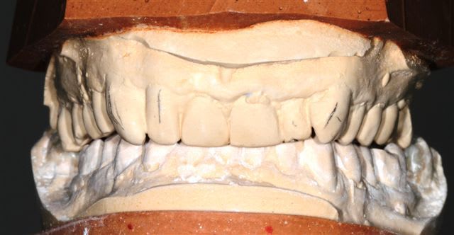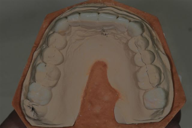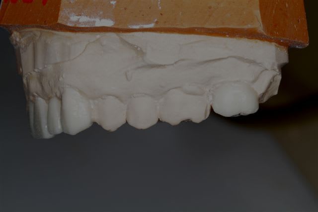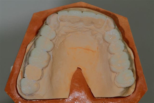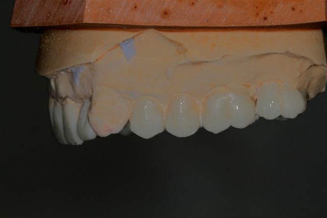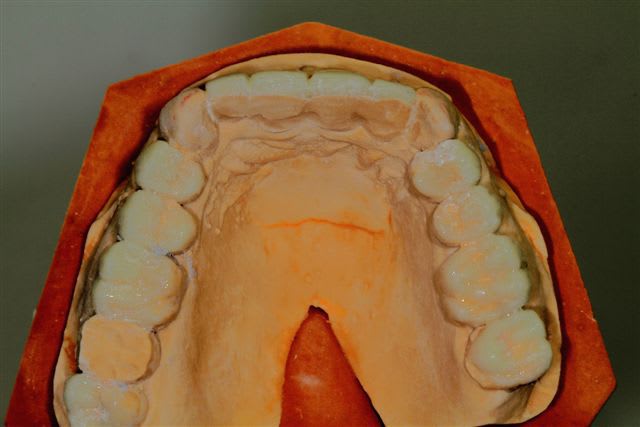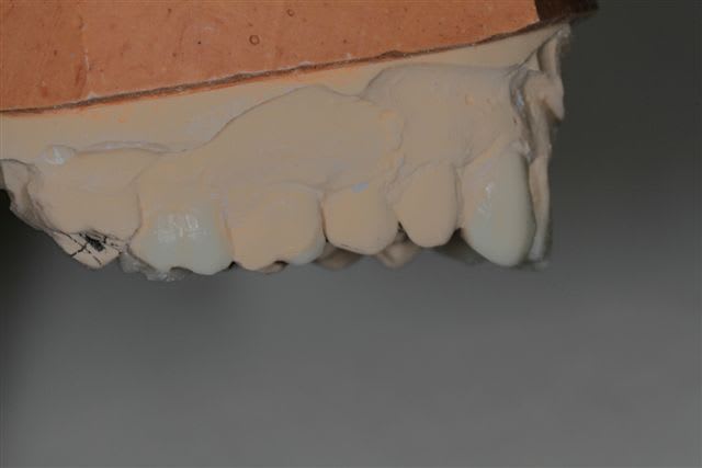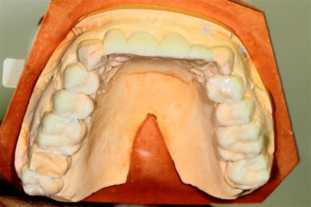 comme je l'ai dis plus haut le wax up ne parle pas à la patiente, j'ai donc au cours d'un rdv long, et à partir d'une empreinte du waxup, fait un "provisoire de présentation" en résine, sans fioriture juste pour que la dame comprenne mieux ce que je pouvais essayer de lui apporter.