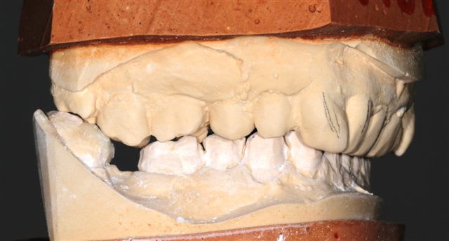 Le secteur antérieur doit donc supporter pas mal de contraintes... d'autant plus que le guide incisif semble assez fermé.