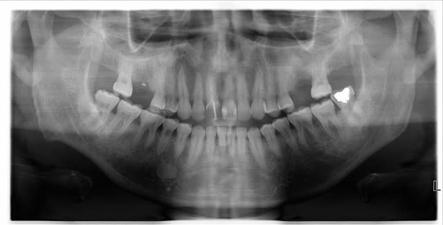 La radio de 45 révèle une carie ??? mais en bouche pas de point d'entrée, et le test de vitalité est positif mais pas douloureux.