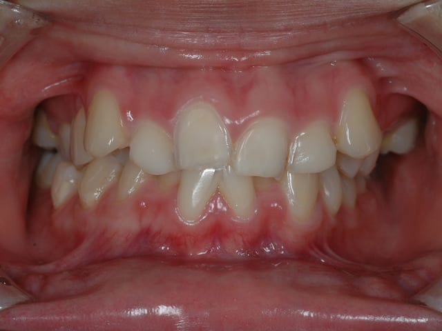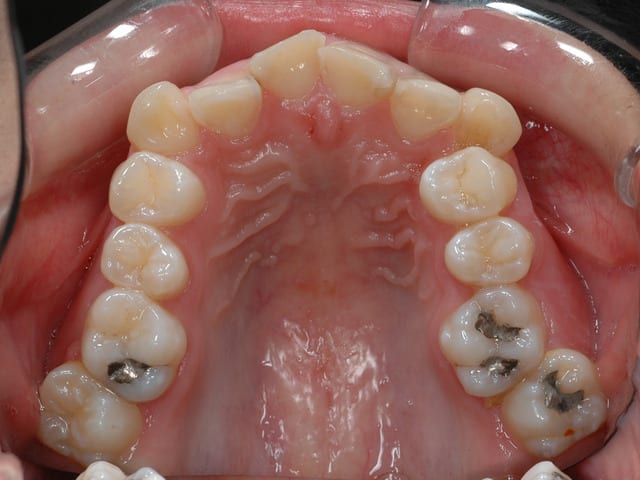 c'est peut etre a cause du bandeau metallique vestibulaire d'une plaque amivible d'interception qui visait à corriger l'endognathie maxillaire..