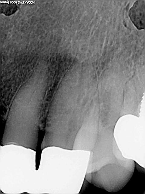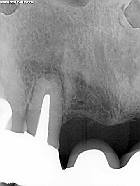Sauf que la solution de la chir apicale n'existe pas dans ce cas là. Pour moi, la dent n'est pas conservable point. Car ratio couronne/racine de 3 pour 1 aggravé par une chir apicale, car pas 5 mm de gutta entre le tenon et l'apex, car gros risque de fracture de la racine.