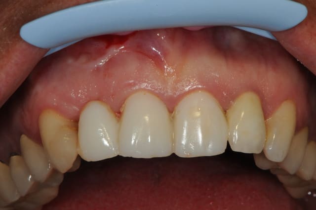 deux mois après (photo 2-3-4), l'état de la gencive me paraît plutôt sympa et je propose donc d'en rester là. toutefois la patiente ne veut pas, elle à peur de perdre le bridge (même le définitif) , bref, elle veut un implant !