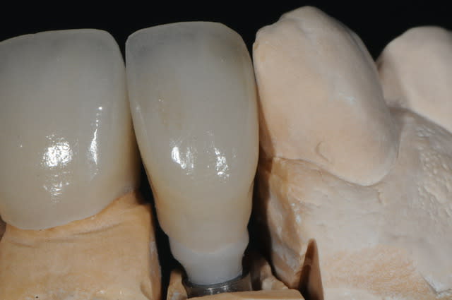 C'est dommage car ta partie est très bien gérée et au final entre les couronnes dento et implanto portées la luminosité n'est pas la même, est-ce que c'est le même type de couronnes ?