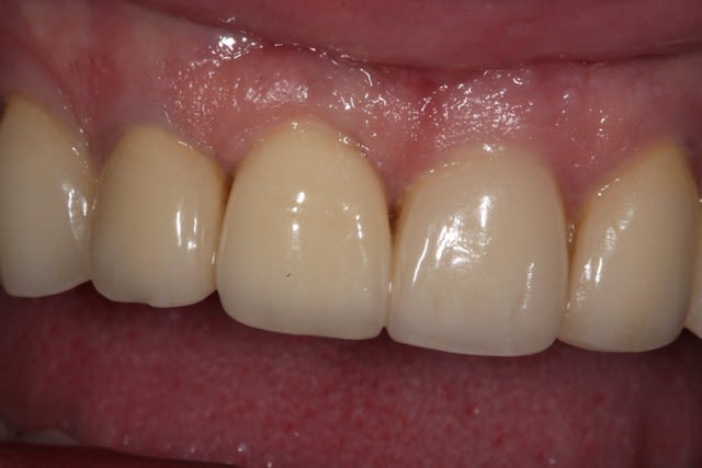 21 aussi, papilles gingivales un peu effondrées entre 21-11 et 21-22, et 21 plus courte (l'implant est figé dans l'os, les dents naturelles ont, elles, pu migrer un peu en 2 ans?)