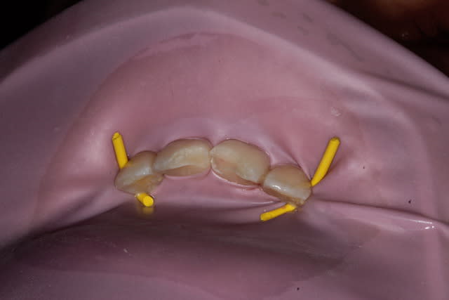 Mmh, on voit bien que la fracture a emporté en grande partie la face palatine, on va préparer les 3/4 de la dent pour faire une "facette" moi j’appelle ça une couronne ;)