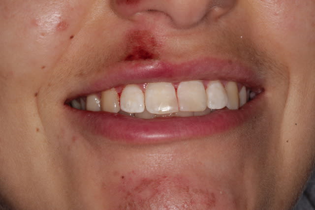 Coup de fil en urgence ce matin. Une patiente de 20 ans s'est cassé les incisives devant une boite de nuit lors d'une bousculade.