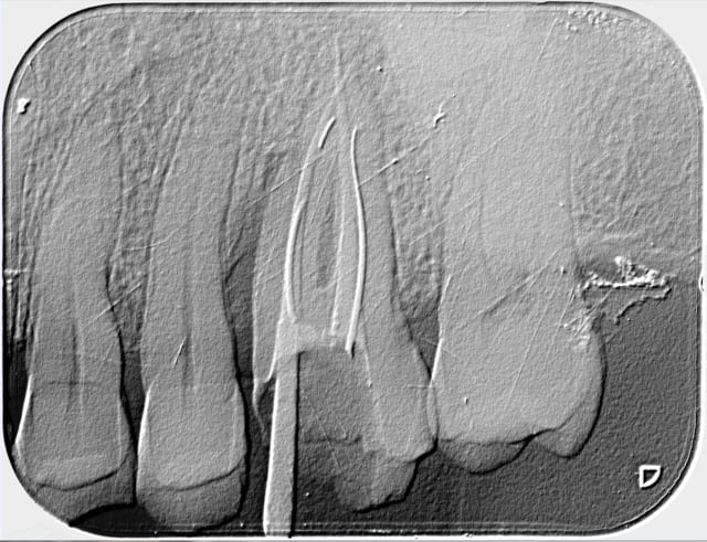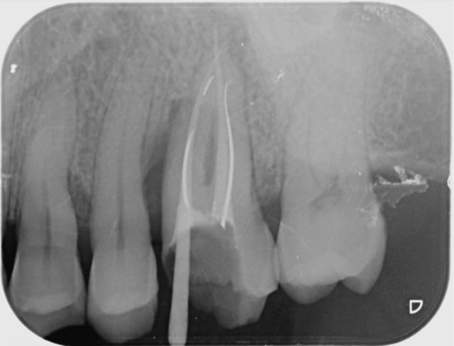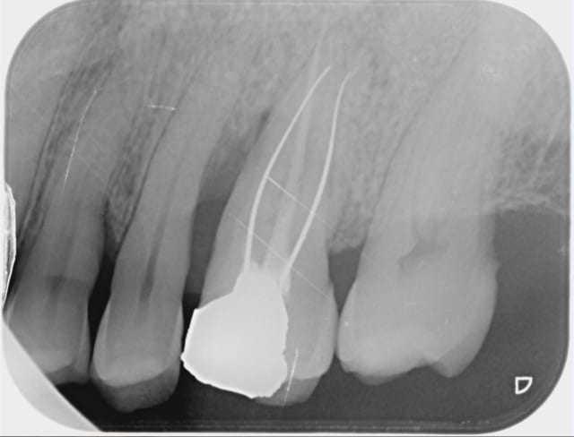 Voici le résultat d'une 3ème séance de recherche du MV 2 le vague à l'âme expliquant l'absence de digue , et mv 2 que j'aurai nommé le CCE pour casse couille endodontique mais n'étant pas endo exclusif je reste courtois avec cette désespérance souvent absente radiologiquement après obturation et dont le trajet incertain me laisse rêveur , quand à la guérison de l'image en mésial prions pour que Saint NaOCl et Saint EDTA veillent sur nous .
