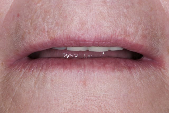 je dirais qu'il faudrait une photo avec un sourire plus naturel, pour mieux voir la forme des lèvres lors du sourire et adapter les dents à ça
