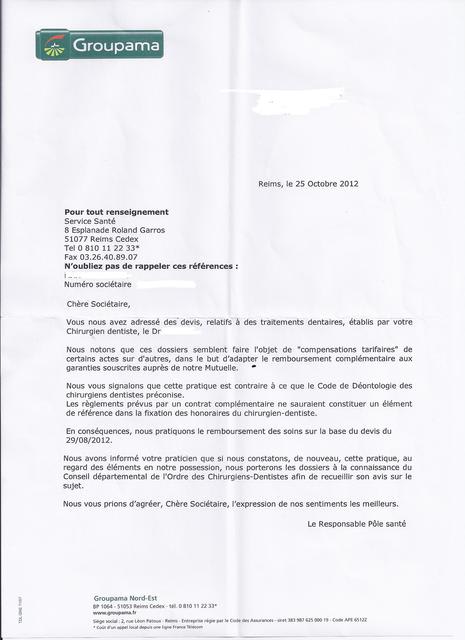 Groupama (pour ne pas les citer!!) lui indique qu'elle sera remboursée sur la base du 1er devis qu'ils ont reçu, que la pratique du dentiste est contraire à la déontologie...
