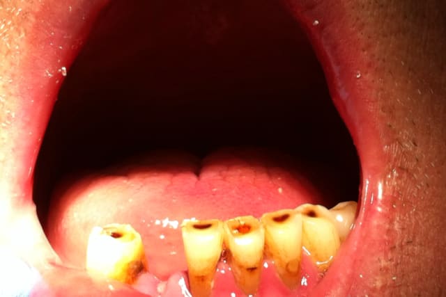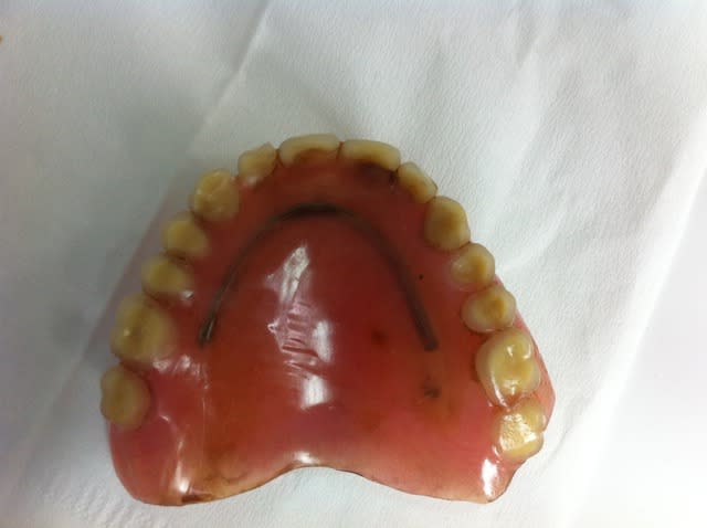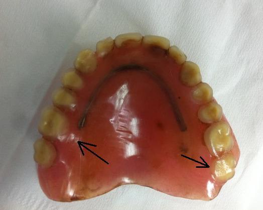 > ses dents toutes usées et des fractures de résine à plusieurs endroits.