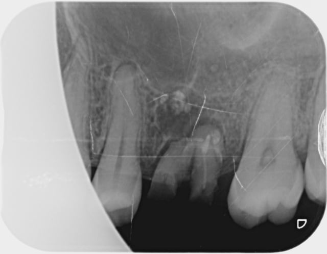 J'ai accueilli cette patiente un peu phobique , fait une anesthésie , une avulsion , un curetage de l'alvéole qui contenait de la pâte canalaire , le tout avec application de façon à ne pas pénétrer le sinus , vérifier une possible CBS , et suturer le tout .
