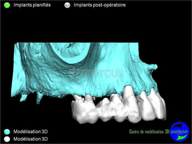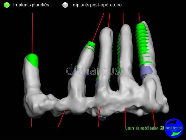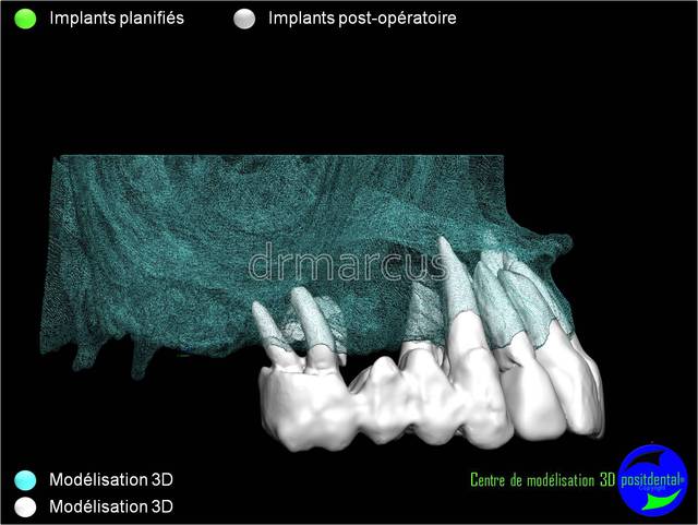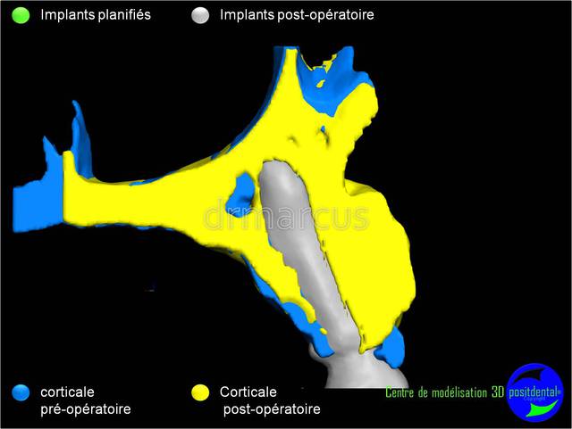 Dommage que ce soit scanner avant et Cone-Beam après. Il est vrai que l’interprétation peut différer. Toutefois on voit la parfaite superposition des implants entre la planification et la réalisation. J'en conclue que le système Positdental est relativement fiable ;-))))