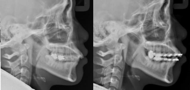Pour une fois je ne suis pas tout à fait d'accord avec toi. La superposition des deux radios ne montre pas grande chose quand on sait qu'on est en train de parler sur des dixièmes de millimètre ! Par contre on voit une classe I molaire sur la première radio et une classe II presque complète sur la deuxième et je ne crois pas qu'une minime rotation postérieure puisse "reculer" la mandibule et la molaire inférieure autant! Je crois bien que les deux problèmes coexistent à savoir: un repositionnement postérieure de la mandibule avec une rotation postérieure due à l'egression des deuxièmes molaires et l'apparition de points de prématurité .