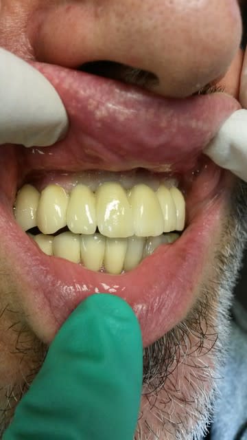 j'ai oublié de dire que c'est un travail posé en 2005 . revue il y a quelques semaines . même le petit bridge mandibulaire n'a pas bougé malgré les attachements du stelite