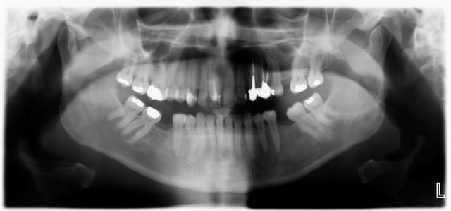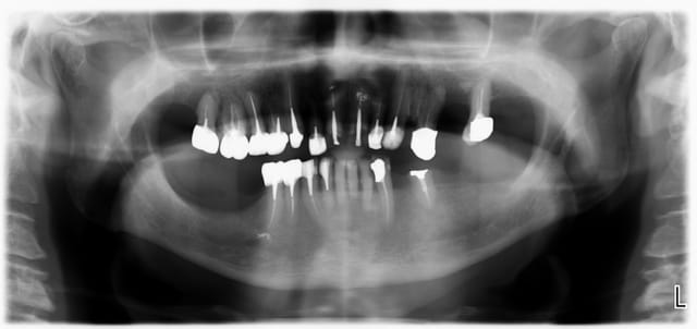bridge antérieur , car la pose d'implants nécessitait de la reconstruction trop importante, endo couronne sur les molaires mandibulaires par manque de hauteur, onlay. implants à la mandibule.