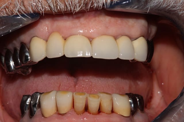 bridge antérieur , car la pose d'implants nécessitait de la reconstruction trop importante, endo couronne sur les molaires mandibulaires par manque de hauteur, onlay. implants à la mandibule.