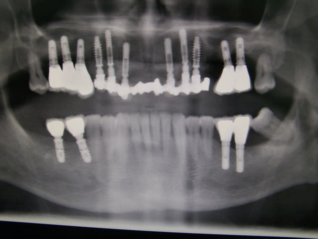 Les implants utilisés sont des LEONE, pilier cône morse, les bridges à armature métal provisoires sont simplement mise en place sans scellement et bien sur aucune vis. La prothèse définitive se fera comme un bridge traditionnel sur moignon.