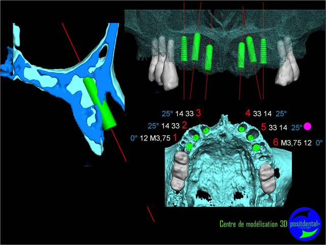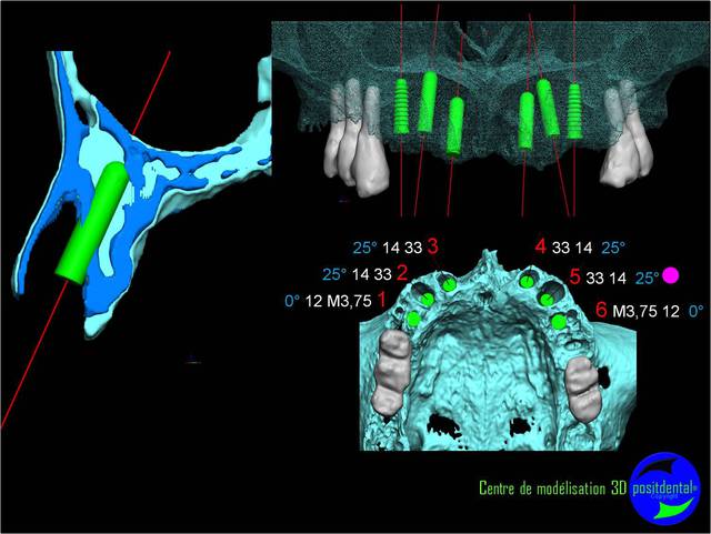 Si tu as suivi les cas présentés depuis plusieurs années les bridges provisoires ont une armature métal pour la rigidité du fixateur externe, l’intervention se déroule en 1 seul temps chirurgical donc sans prise d’empreinte, c’est pour cela que je parle de MCI. Pour la passivité du bridge avec le système Nobel Guide et leurs piliers expansifs je n’ai vue aucun cas clinique présenté sur le forum. As-tu déjà utilisé le procédé ? Dans les cas présentés sur la vidéo, aucune clé de positionnement n’a été utilisée, le placement des piliers se fait selon la simulation implantaire assistée par ordinateur, leurs présentations a été faite en prospective par OTP, modèle 3D et à la demande de beotien la solution pilier fixe a été retenu à la place du bridge transvisé. Quel sont les compléments d’information que tu as besoin et ou la photo ne te suffi pas ? Pour le protocole d’une MCI, empreintes des maxillaires, dimension verticale de l’occlusion, définition de l’esthétique souhaitée, prescriptions, réalisation du Positscan, traitement des informations à partir des données DICOM, simulation implantaire assistée par ordinateur, validation, réception des DMSM selon les types d’implants et encastillages les procédures varient. Quel système implantaire utilise-tu ?