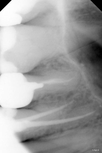 pour la radio, c'est la radio 1 mois après traitement,juste avant que je la désobture donc, les douleurs ont commencé 15 j après le premier traitement, quand elle a arrêté le traitement antiinflammatoire pour son dos.