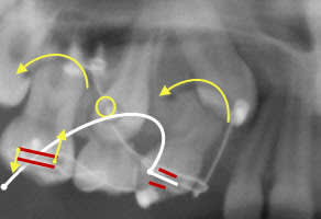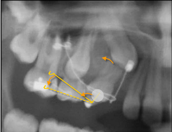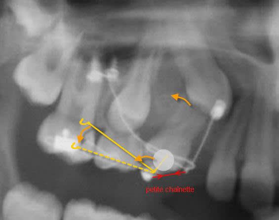 - le bras qui sort de la 14 en distal et qui passe en occlusal pour exercer une force anti-horaire, tu peux l'accrocher directement sur la ligature reliée à la canine après avoir décroché le CT8. C'est lui qui le remplacera pour exercer la traction canine.