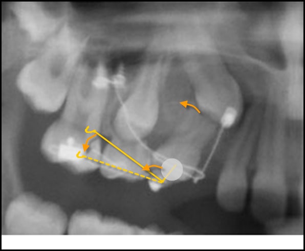 Erreure d'expression de ma part, j'essayer de dire que la force intrusive sur la 14 serait sans conséquence sur cette dent car le fil de TMA sur lequelle le système serait fixé exerce une force extrusive.