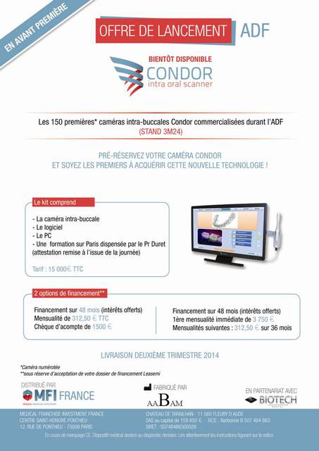 Schein distribue la Trios produit danois), avec cart, ordi, écran tactile, soft ortho analyzer, mises à jour, formation in situ pour 1174/mois pendant 60 mois, soit la modique somme de 70000€