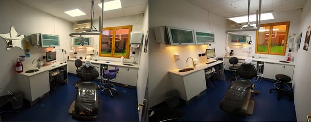 Les LED ne possèdent pas a l 'heure actuelle un spectre proche de la lumière du jour. La température 6000 K ne veux rien dire.La photo de Cingulum montre une mauvaise répartition de lumière dans la salle de soin et vraisemblablement un manque de quantité.On doit mesurer environs 1500 a 2000 lux au niveau de la têtière .Les tubes fluorescents adaptés fournissent une lumière d 'excellente qualité.Avec un tel éclairage la réalisation de soins tels que les composites antérieurs est facilité .L'éclairage opératoire est sur off.