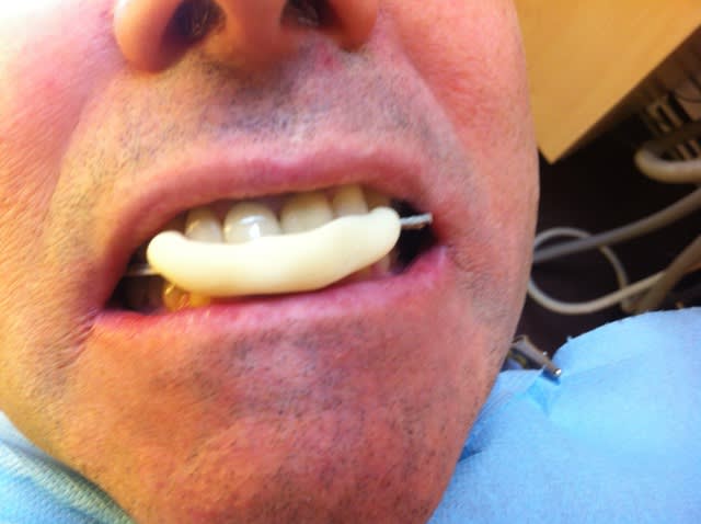 Dans les cas complexes il est plus simple alors de réaliser des gouttieres rigides "clippées" sur la mandibule et "rebasées" occlusalement de loin en loin. Si le patient ne supporte pas il peut les enlever et si la modification de l'occlusion est telle que je prends peur (il ne le supportera jamais, me dis-je!!!) celà me rassure intellectuellement: si je me suis planté on changera la gouttiere...
