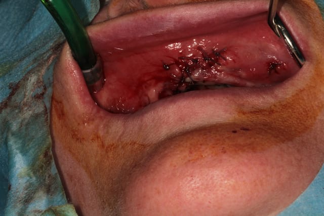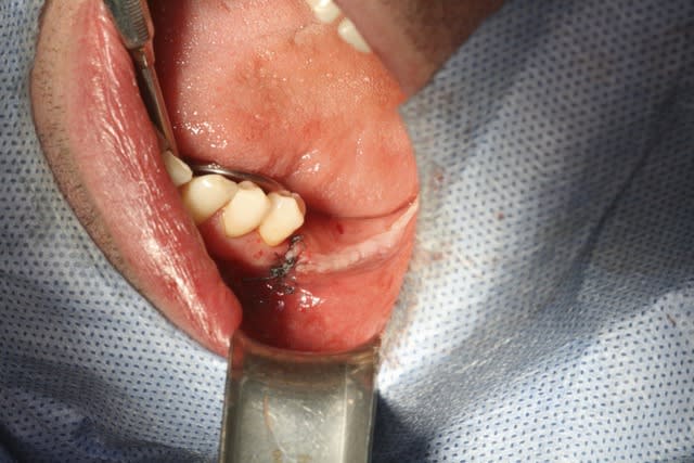 par contre j'ai mis deux vis, la plus distale à travers la gencive, avec suture.