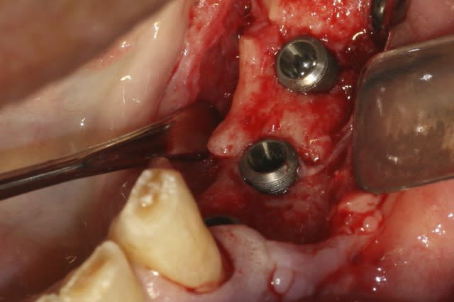 J'ai des photos de la réouverture de ce cas et de la pose des implants, j'ai même fait une expansion, pour justifier de la solidité de l’attache des blocs...