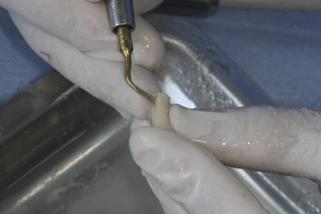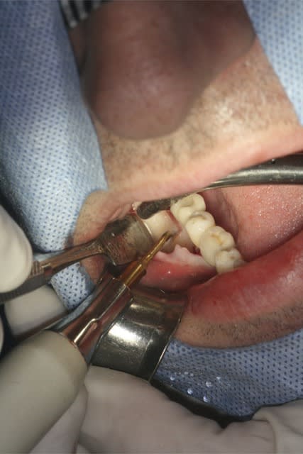 image1 réouverture et dépose du matériel ( du tissu fibreux s'est insinué dans les fentes mésiales et distales que j'ai du cureter)