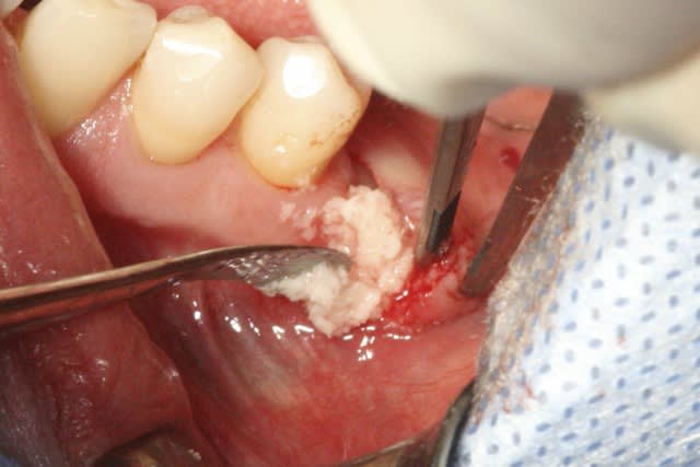 Pour une augmentation horizontale, l'incision et le décollement (" soulèvement" ) du lambeau est identique, sauf que tu insère le matériau directement en latéral, et que je préfère dans ces cas là de l'allogène ( cf post précédent)