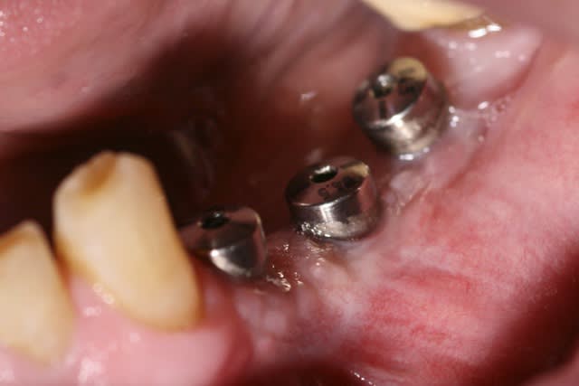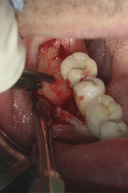 J'ai des photos de la réouverture de ce cas et de la pose des implants, j'ai même fait une expansion, pour justifier de la solidité de l’attache des blocs...