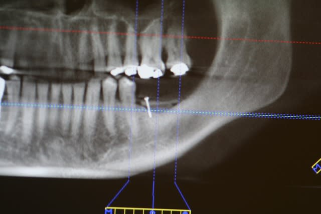 par contre j'ai mis deux vis, la plus distale à travers la gencive, avec suture.