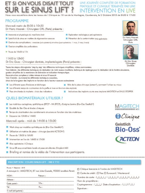 Le Dr. Eric Guez ainsi que le Dr. Harry Maarek vous propose une journée de formation le mercredi 2 octobre 2013 dans les labo d'I Clinique a Courbevoie.