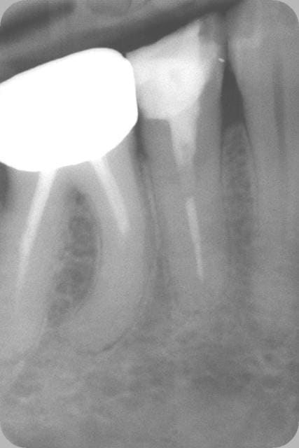 Le tenon fibré c'est la zone radioclaire au dessus, noyé dans le composite. On voit qu'il n'y a pas de gutta ni de ciment qui débordent.