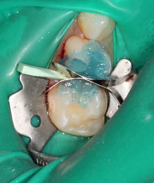 Du moment qu'il y a une matrice, que le bord proximal est propre et qu'il y a un coin interdentaire, la cavité reste sèche pendant une minute le temps de faire l'obturation et ça tient très bien (plusieurs années).
