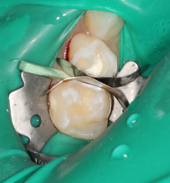Du moment qu'il y a une matrice, que le bord proximal est propre et qu'il y a un coin interdentaire, la cavité reste sèche pendant une minute le temps de faire l'obturation et ça tient très bien (plusieurs années).