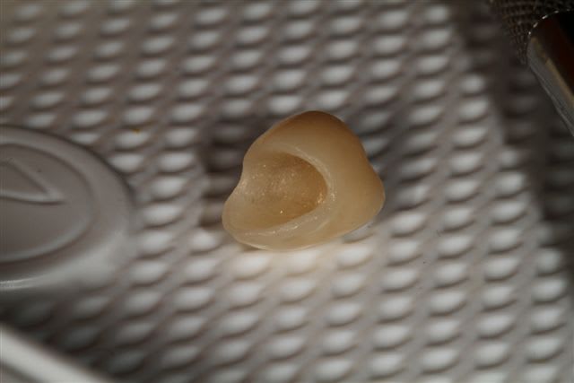 Ce qui est interessant, c'est la difficulté d'éliminer les traces de ciment hors de la cavité buccale, ça permet de comprendre que lors d'une scellée conventionnelle en bouche, l'elimination des trace de ciment tiens du rêve...