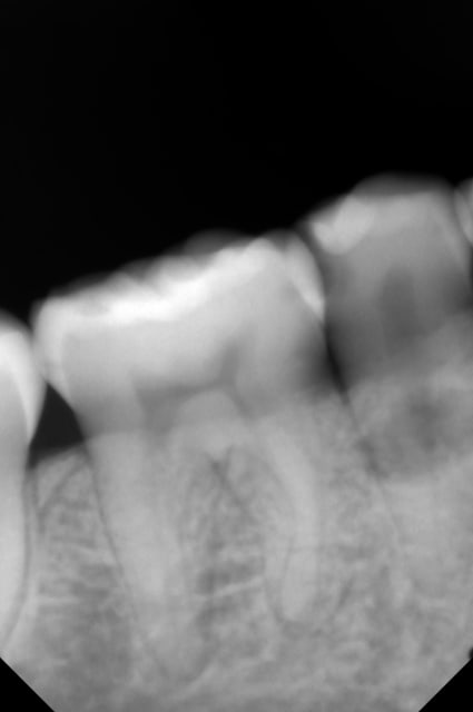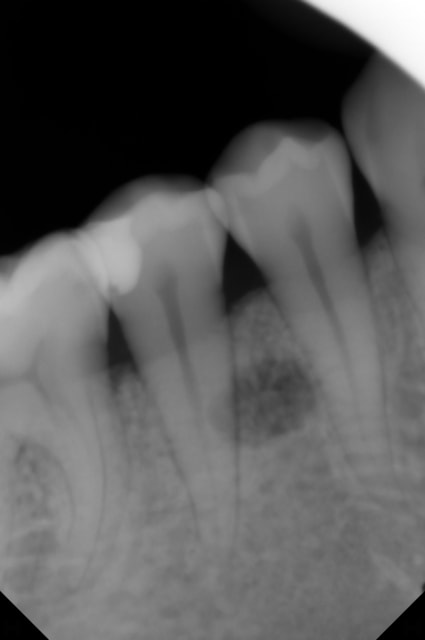 Une patiente 25 ans me décrit des douleurs relativement intenses au froid sur la 45. Je fais une rétro, je visualise la carie et une image radioclaire en regard de la 45.