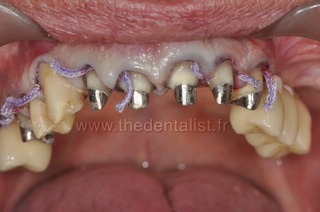J'ai arrêté les fils car effraction de l'attache épithéliale et risque de perte d'attache, donc je préfère ramer un peu à l'essayage d'armature et jouer de-ci de-là sur l'épaisseur de ciment/colle.