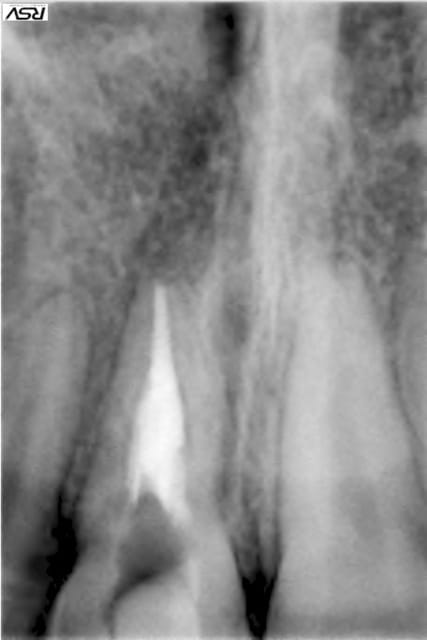 Si la résorption est purement interne, une obturation à la gutta est correcte. Une obturation à la BioDentine ou au MTA n'a d'intérêt que s'il y a déjà une communication endo-paro.
