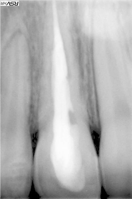 Les résorptions internes lorsqu'elles sont correctement obturées (ce qui à l'air d'être le cas) ont normalement un bon pronostic dans la mesure où le phénomène de résorption s'arrête.