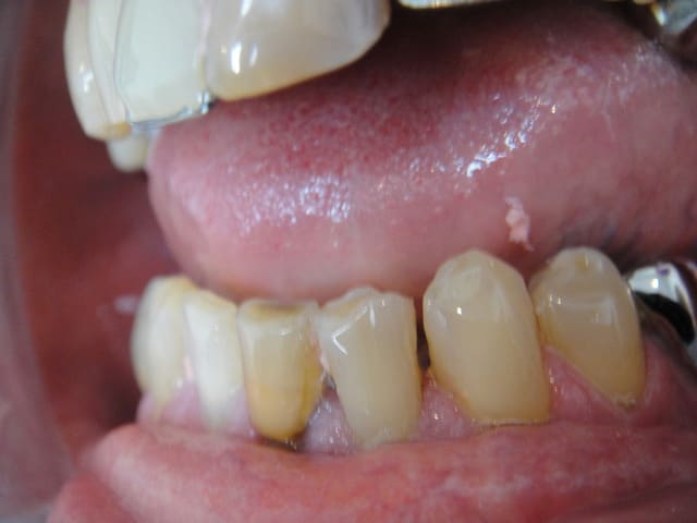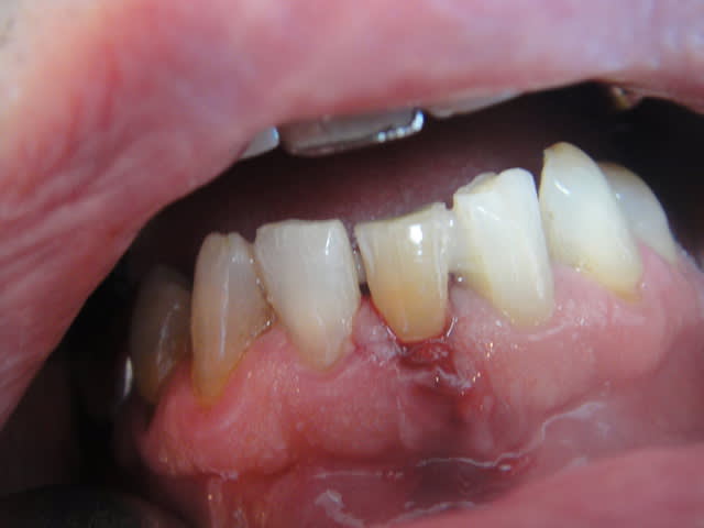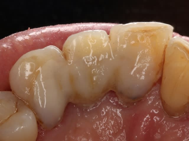 Tiens belle maman est passée au cabinet ce matin, j'avais déjà parlé d'un bridge collée réalisée en Vectris/Targis (du composite et une armature en fibre de verre: un produit Ivoclar des années 90). Voici des images au bout de 3 ans de collage.