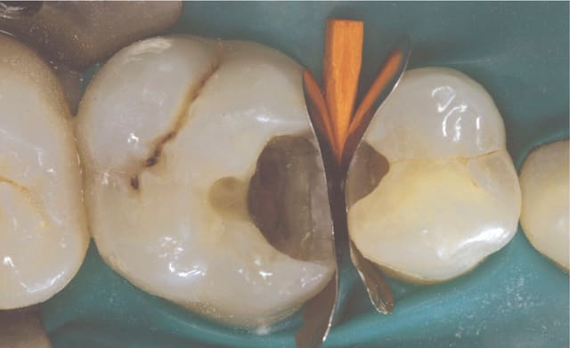 Si 2 cavités contiguës: 1 après l'autre sans matrice pour la première uniquement Wedge puis retouche fraise, enfin matriçage pour la deuxième.