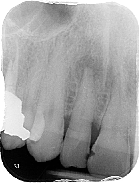 Dans ce cas, la racine baignait dans le pus, ça ne m'a pas paru être une bonne indication de comblement immédiat. J'ai préféré laisser une voie de drainage et le système immunitaire faire le ménage.